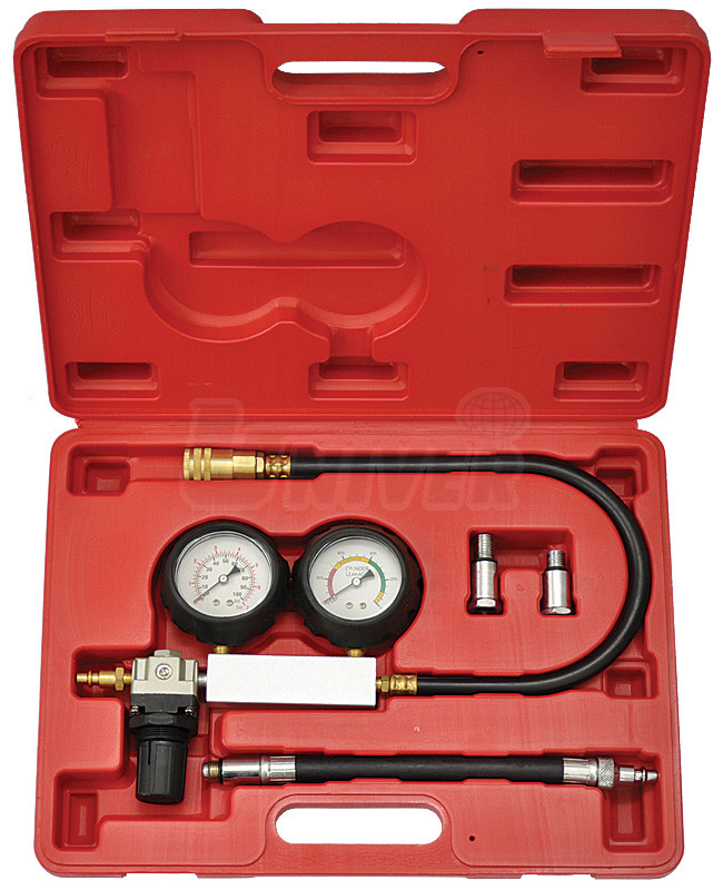 - přístroj se na spalovací prostor napojuje zpravidla pryžovou hadicí pomocí adaptéru přes otvor pro zapalovací či žhavicí svíčku, daný prostor se natlakuje přes přístroj stlačeným vzduchem a následně měří pokles tlaku, barevně rozlišená stupnice tlakoměru charakterizuje, zda je těsnost v pořádku nebo naopak, a v jaké míře