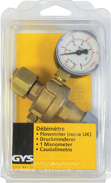Regulátor tlaku svařovacích plynů pro průtok 12 l / min s jedním tlakoměrem, ventilem, šroubením a přípojkou na hadici dodává francouzská firma GYS.