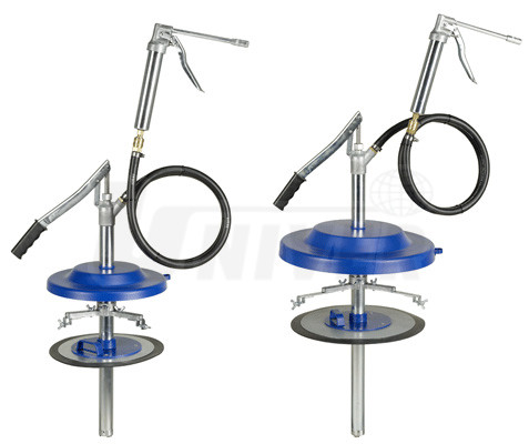 Ruční pákové vysokotlaké mazací přístroje s jednoručním mazacím lisem se nasazují přímo na běžné nádoby s plastickými mazivy a umožňují mazání různými mazivy (až do klasifikace NLGI 2).- jednoruční mazací lis (17 600), M 10 x 1 mm, zástrčný nipl pro rychlospojku Rectus, Typ 26, mazací tlak až 550 bar, objem maziva na 1 zdvih 0,4 cm3, pozinkovaná povrchová úprava, přímý kovový nástavec, M 10 x 1 mm, 150 mm (12 435), precizní 4-čelisťová hubice, M 10 x 1 mm (12 631)