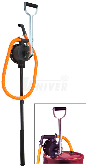 Ruční pákové pístové sudové čerpadlo s pístem z PTFE, s pákou s držadlem a výtokovou hadicí pro čerpání kyselin, louhů, benzinu, nafty, petroleje, olejů, alkoholů, vody atd. ze sudů 20 l až 210 l.- nalézá široké uplatnění pro čerpání kyselin, louhů, benzinu, nafty, petroleje/kerosinu, olejů, alkoholů, vody atd. ze sudů 20 l až 210 l