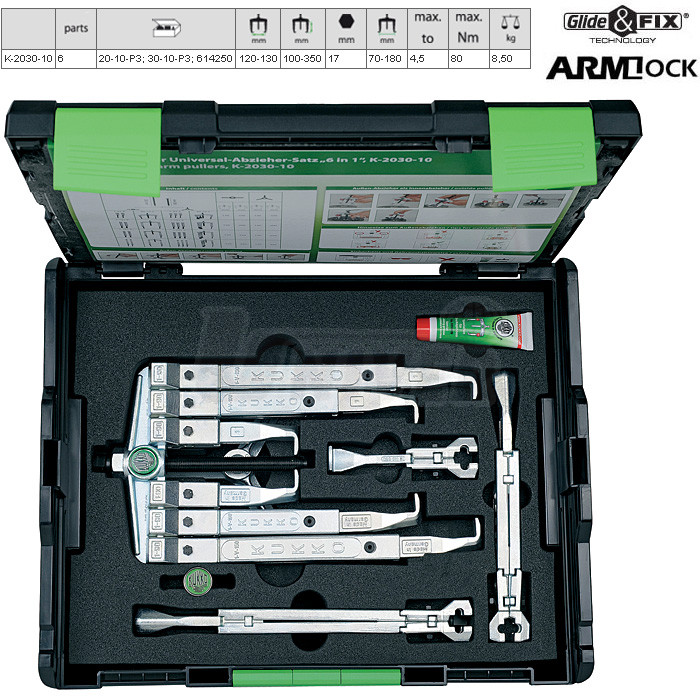 Sada 2- a 3-ramenných třípárových stahováků s posuvnými háky německé firmy KUKKO-Werkzeugfabrik patří do nejvyšší kvalitativní třídy v Evropě.Ze 6-dílné sady v plastovém kufříku KUKKO BOX SYSTEM lze sestavit stahováky: