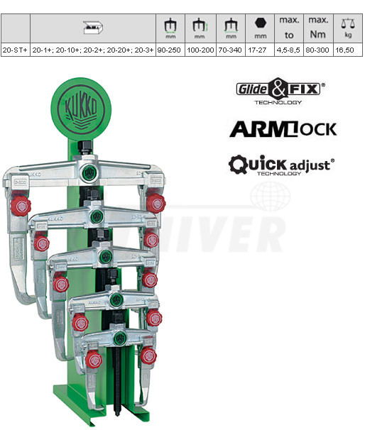 Sada pěti 2-ramenných stahováků s posuvnými háky na stojánku německé firmy KUKKO-Werkzeugfabrik patří do nejvyšší kvalitativní třídy v Evropě.Vlastnosti: