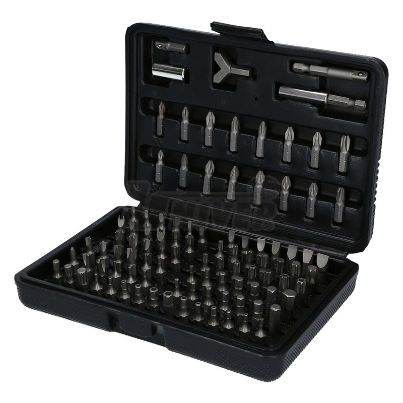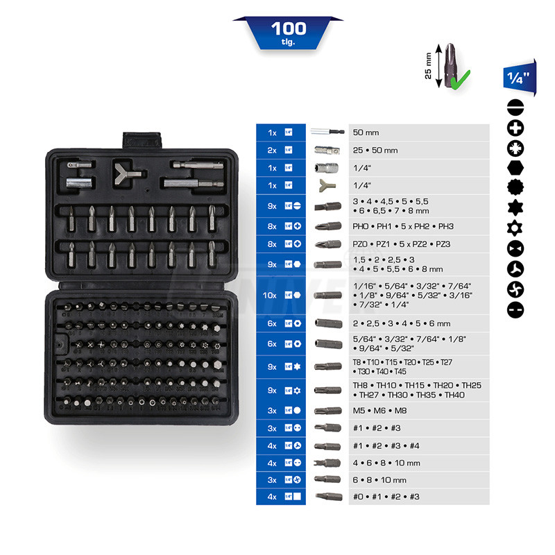 Sada bitů (100 ks) 1/4" (6,3 mm) délky 25 mm s magnetickým držákem a nástrčným adaptérem 1/4" (6,3 mm) v praktickém úložném boxu.Rozměry boxu 200 x 135 x 40 mm, hmotnost 690 g.