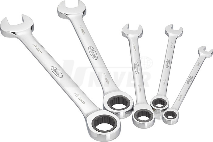 5-dílná sada dlouhých očkoplochých ráčnových klíčů z kvalitního chrom-vanadia, mají štíhlé leštěné hlavice, očkovou přepínatelnou ráčnu se 72 zuby a chromovaný povrch. Jsou určeny pro náročné použití zejména v obtížně přístupných místech (otočný úhel 5°).Sada obsahuje tyto klíče: