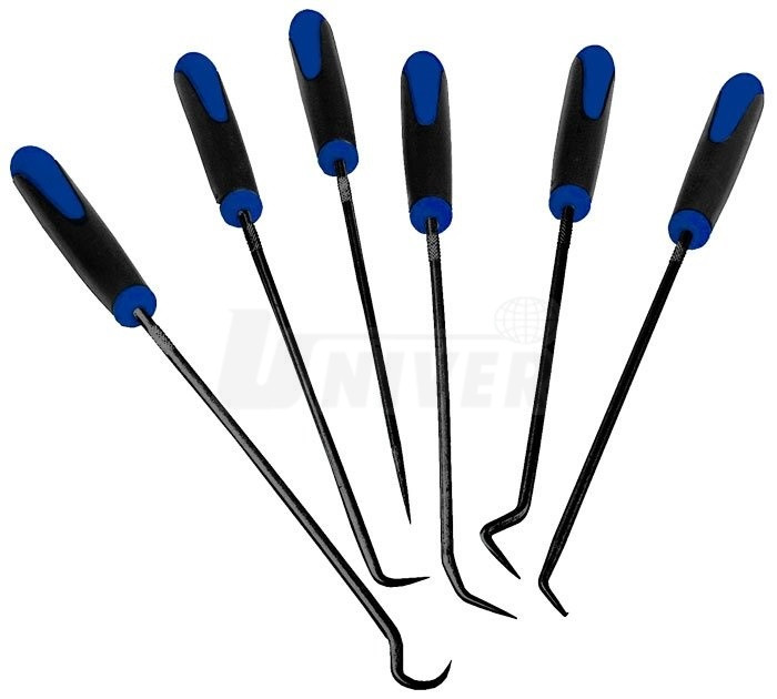 Sada (6-dílná) různě tvarovaných háčků a jedné špičky s dvoukomponentními ergonomickými plastovými rukojeti.- 6-dílná sada jedné špičky a 5 různě tvarovaných háčků