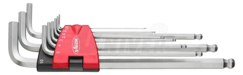 9-dílná sada zahnutých imbusových klíčů s kulovou hlavicí vysoké kvality je vyrobena z chrom-vanadia. Klíče jsou umístěny v plastovém držáku.Sada obsahuje imbusové klíče velikosti 1,5 - 2 - 2,5 - 3 - 4 - 5 - 6 - 8 - 10 mm.