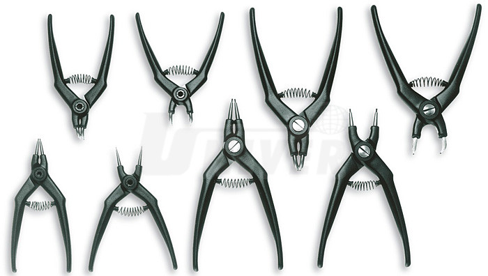 8-dílná sada kleští na vnější i vnitřní pojistné kroužky z vysoce kvalitní speciální oceli. Umožňují rychlou a bezpečnou práci s různými pojistnými kroužky různého průměru. Mají precizní, broušené a fosfátované špičky, plastové, extrémně odolné, ocelí vyztužené části, zpětné pružiny a ergonomické rukojeti, což umožňuje vysoký přenos síly na čelisti. Samozřejmostí jsou perfektně vyrobené klouby s velmi úzkou tolerancí rozměru otvoru pro čep.Sadu tvoří tyto kleště: