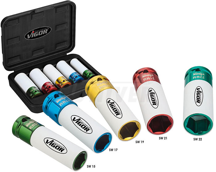 5-dílná sada speciálních kovaných hlavic 1/2" na hliníkové disky v plastovém kufříku obsahuje hlavice 15/17/19/21/22 mm. Ty jsou v provedení s ochranným potahem, který zabraňuje poškození hliníkových disků při utahování kolových šroubů pneumatickým utahovákem.