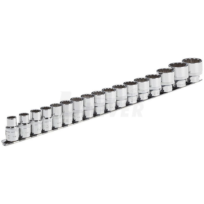 17-dílná sada víceúčelových multiprofilových nástrčných hlavic 1/2" obsahuje tyto hlavice (dl. 38 mm):10, 11, 12, 13, 14, 15, 16, 17, 18, 19, 20, 21, 22, 24, 27, 30, 32 mm.