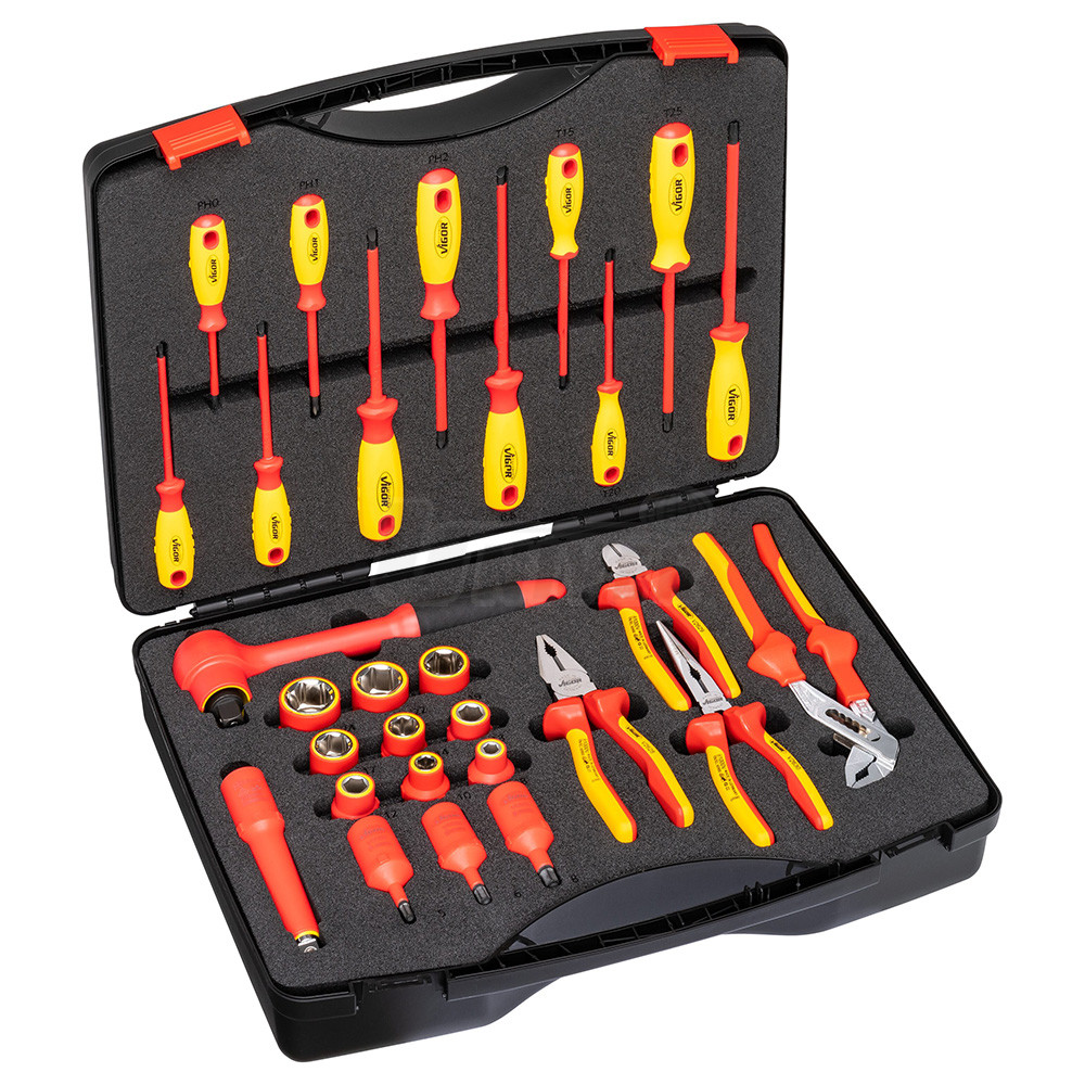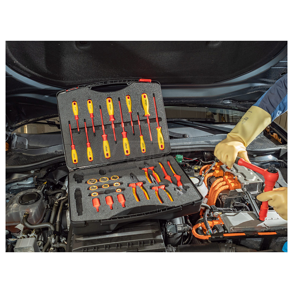 29-dílná sada nářadí VDE pro bezpečnou práci až do napětí 1 000 V (střídavé napětí) nebo 1 500 V (stejnosměrné napětí) podle normy DIN EN 60900.- umožňuje například bezpečné vypnutí proudu elektromobilů