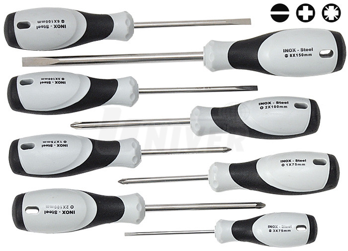 Sada různých šroubováků s ergonomickou rukojetí, které jsou vyrobeny z vysoce kvalitní nerezové oceli (INOX). Vynikají mechanickou odolností a dlouhou životností. Výborně se hodí pro práci např. v extrémně vlhkém prostředí, v častém a delším kontaktu s vodou, chemikáliemi apod., kdy klasické šroubováky dříve či později zkorodují. Obsah 8-dílné sady v kartonovém/blistrovém obalu:4 ks přímá drážka 3 mm (dl.75 mm) / 5 mm (dl.100 mm) / 6 mm (dl.100 mm) / 8 mm (dl.150 mm)