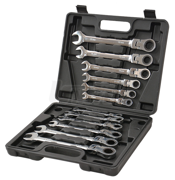 Profesionální 12-dílná sada očkoplochých ráčnových kloubových klíčů - kombinace klasického otevřeného maticového klíče a očkoplochého ráčnového kloubového klíče, kvalitní chrom-vanadiová ocel, provedení - lesk.Očkoploché ráčnové kloubové klíče představují účelnou kombinaci klasického otevřeného maticového klíče a očkoplochého ráčnového klíče, navíc vybaveného kloubem. Ten zvyšuje použitelnost v obtížně přístupných místech. Očkoploché ráčnové kloubové klíče se používají s výhodou tam, kde je aplikace klasických klíčů z důvodu omezeného prostoru pro pootočení klíče vyloučená. Umožňují daleko efektivnější a rychlejší utahování a povolování šroubů/matic bez sejmutí klíče.