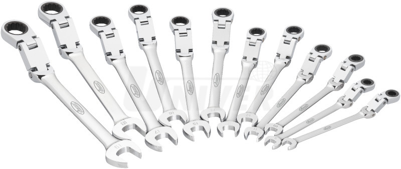 12-dílná sada očkoplochých ráčnových klíčů s dvojitým kloubem (8-19 mm) a s přepínatelnou ráčnou se 72 zuby z kvalitní chrom-vanadiové oceli.- používají se s výhodou tam, kde je aplikace klasických klíčů z důvodu omezeného prostoru pro pootočení klíče vyloučená