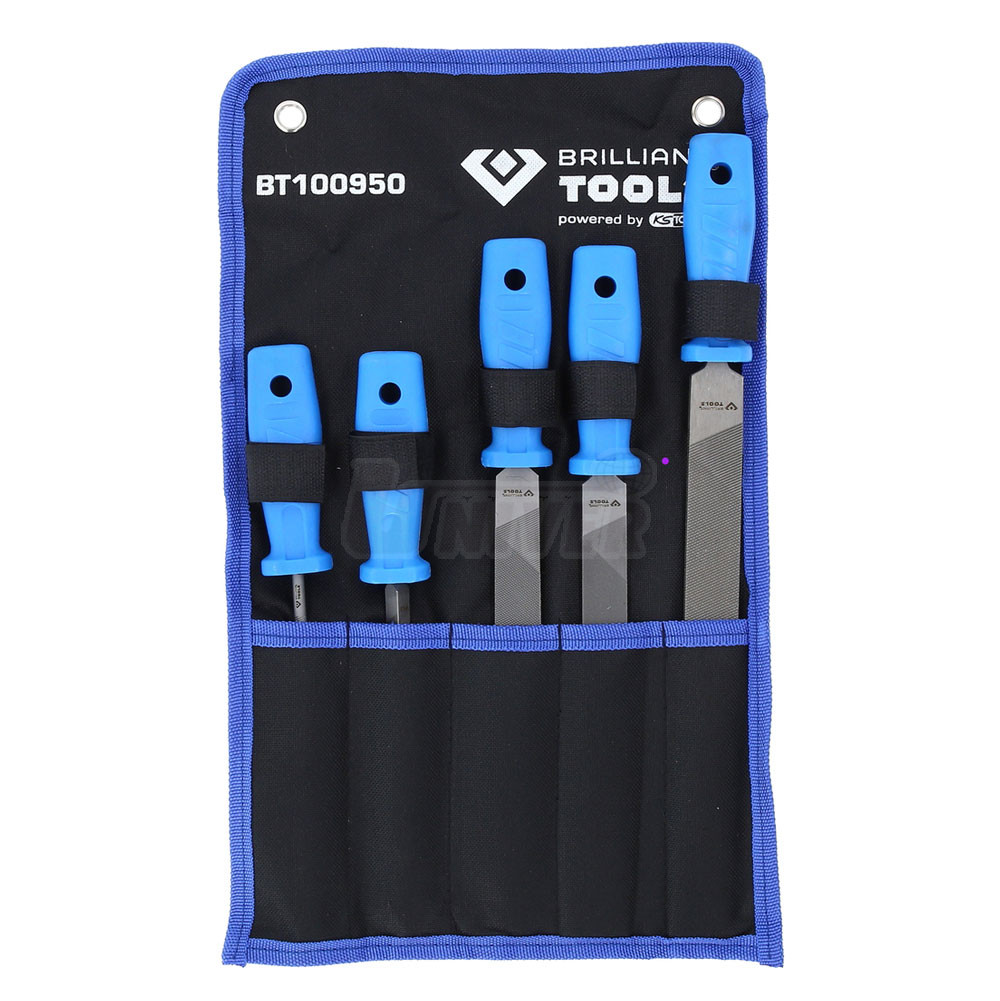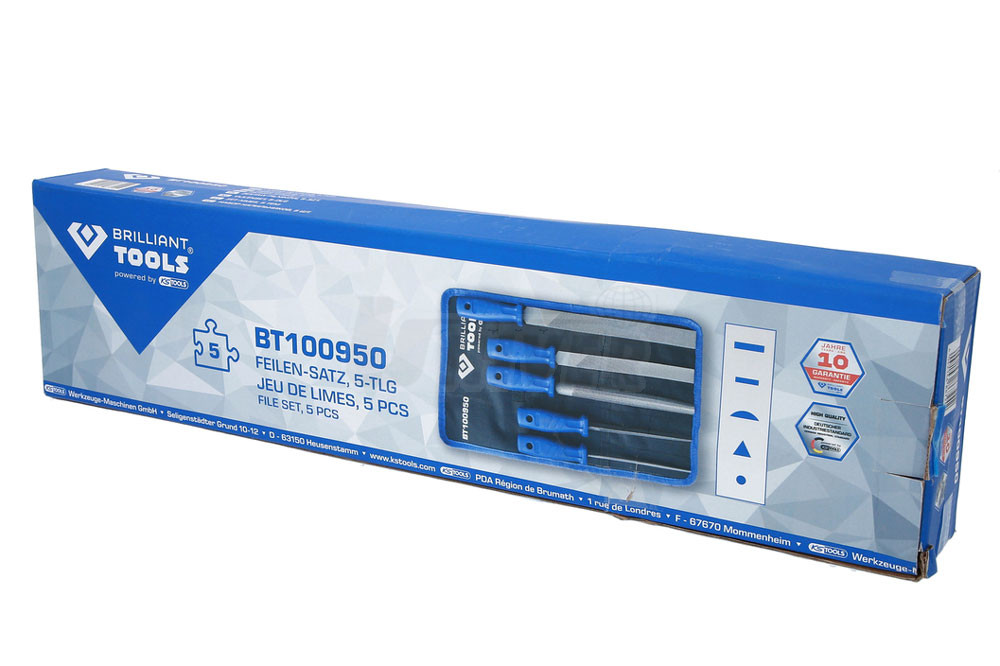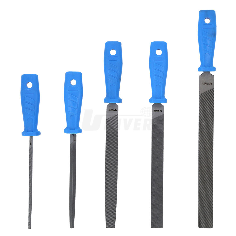 Sada 5 různých druhů pilníků na kov s plastovými držadly se dodává v praktické srolovací tašce.- sada 5 pilníků různého tvaru středně jemných a hrubých ve velikostech 150 až 250 mm