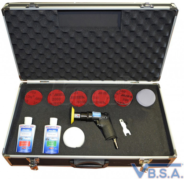 1 ks kufřík 1 ks pneumatická bruska/leštička 1 ks kotouč pro velcro disk /suchý zip 1 ks nádobka s lešticím přípravkem č.1 Spécial Optic 250 ml 1 ks nádobka s lešticím přípravkem č. 2 Spécial Optic 250 ml 30 ks brusný kotouček Standard - zrnění 400 15 ks brusný kotouček Special - zrnění 500 5 ks brusný kotouček Special - zrnění 1000 5 ks brusný kotouček Special - zrnění 2000 5 ks brusný kotouček Special - zrnění 3000 2 ks plstěné lešticí kotoučky 1 ks rychlospojka 1/4" |