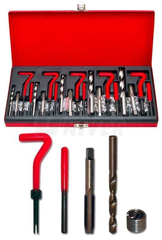 131-dílná sada speciálních přípravků určených pro opravy poškozených (zpravidla stržených) závitů nejběžnějších rozměrů (M5 až M12) v plechové kazetě.Obsahuje tyto komponenty: