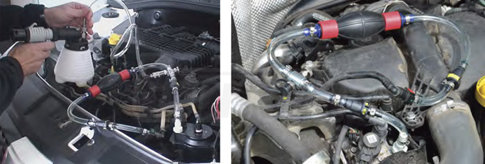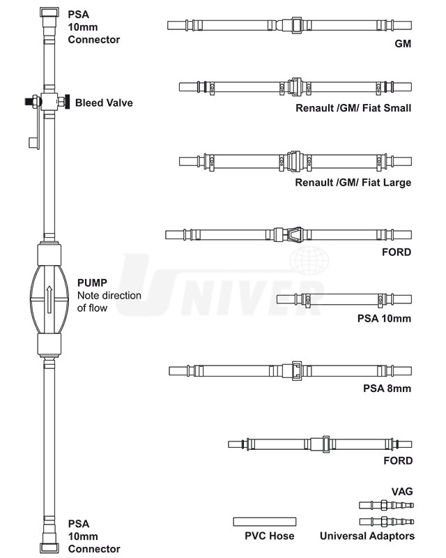 adaptéry, propojovací hadičky a spojky pro odvzdušňování / plnění palivových systémů dieselových motorů (bez palivového čerpadla) např. při výměně palivového filtru nebo vysokotlakého palivového čerpadla atd., kdy v palivovém vedení zůstávají vzduchové bubliny, které je nezbytné odstranit, resp. tento systém odvzdušnit