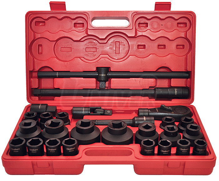 26-dílná sada průmyslových kovaných hlavic 1" a 3/4" s příslušenstvím.Hlavice: 21, 22, 23, 24, 26, 27, 28, 29, 30, 31, 32, 34, 36, 38, 41, 46, 50, 55, 60, 65 mm.