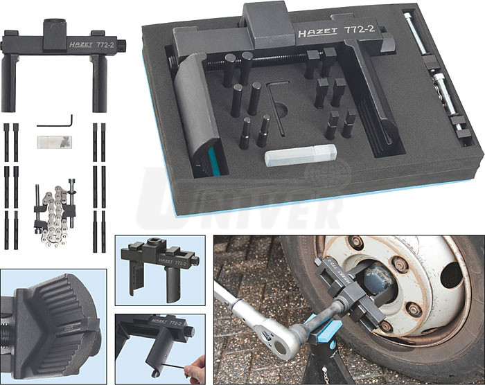 Sada přípravků (16-dílná) pro nápravové a stavěcí matice s drážkou se používá pro téměř všechny známé nápravové matice (např. šestihranné, osmihranné, drážkové, korunkové, dvouděrové apod.). Upínací rozsah 35-170 mm, maximální utahovací moment 700 Nm, vnitřní čtyřhran 3/4".