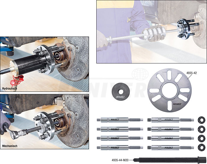 Sada přípravků pro stažení kloubových hřídelí (15-dílná) umožňuje dvojí použití. Při mechanickém stahování se využije vřeteno HAZET 4935-44-M 20, které je součástí sady, nebo při hydraulickém stahování se použije hydraulický válec HAZET 4932-17 (lze dodat zvlášť). Při jeho použití lze stáhnout i extrémně pevně spojené díly. Uplatní se u automobilů VW, Audi, Škoda, SEAT, Alfa Romeo, BMW, Citroën, Peugeot, Fiat, Lada, Lancia, Mercedes-Benz, Opel, Renault, Saab atd.Objednávka tovaru