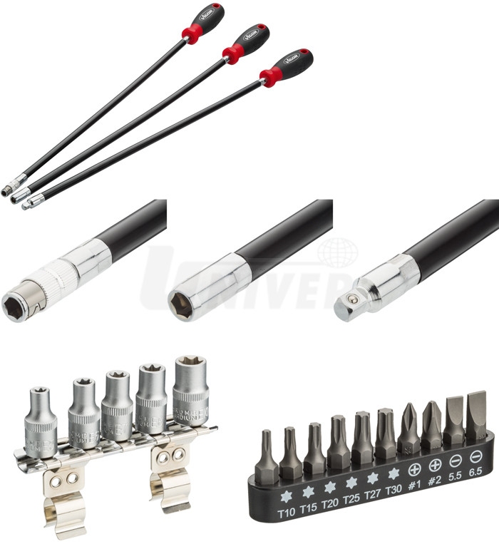 Sada 3 extra dlouhých (500 mm) pružných šroubováků s různými typy připojovacích adaptérů, 5 hlavic E TORX a 10 bitů 1/4" obzvláště vhodných pro práci v omezeném prostoru.- umožňují práci v obtížně přístupných místech