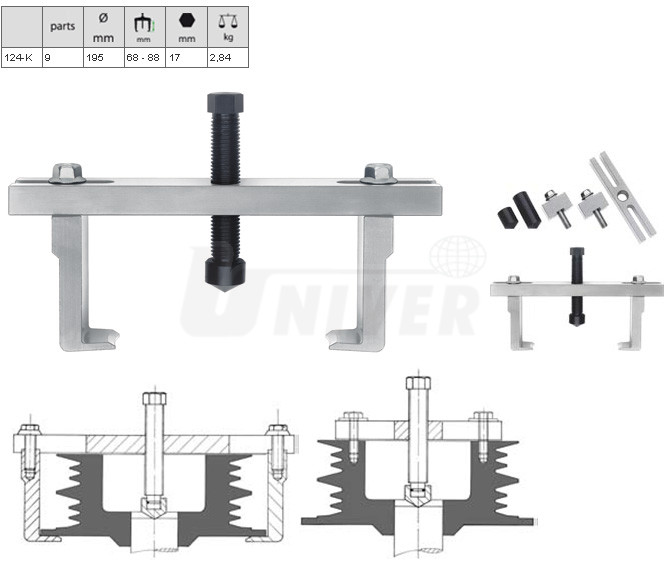 9-dílná sada univerzálního dvouramenného stahovák drážkovaných řemenic automobilů do průměru až 195 mm.Sada obsahuje: