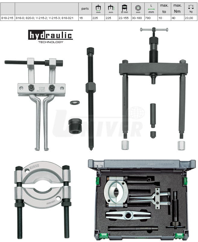 - hydraulický 2-ramenný stahovák s posuvnými vždy paralelními háky KUKKO 820-0 (rozevření 225 mm, délka stahovacích háků 225 mm, 10 t),