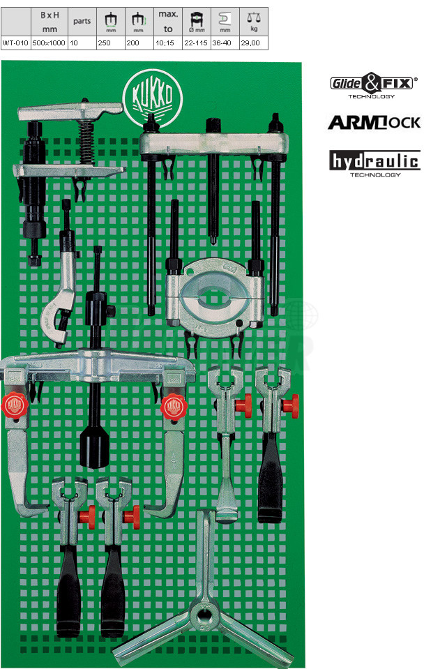 Univerzální základní sada stahováků a dalších přípravků pro těžké nákladní automobily s hydraulickým vřetenem na děrované tabuli 500x1000 mm německé firmy KUKKO-Werkzeugfabrik patří do nejvyšší kvalitativní třídy v Evropě.Z 10-dílné sady lze sestavit tyto stahováky/přípravky: