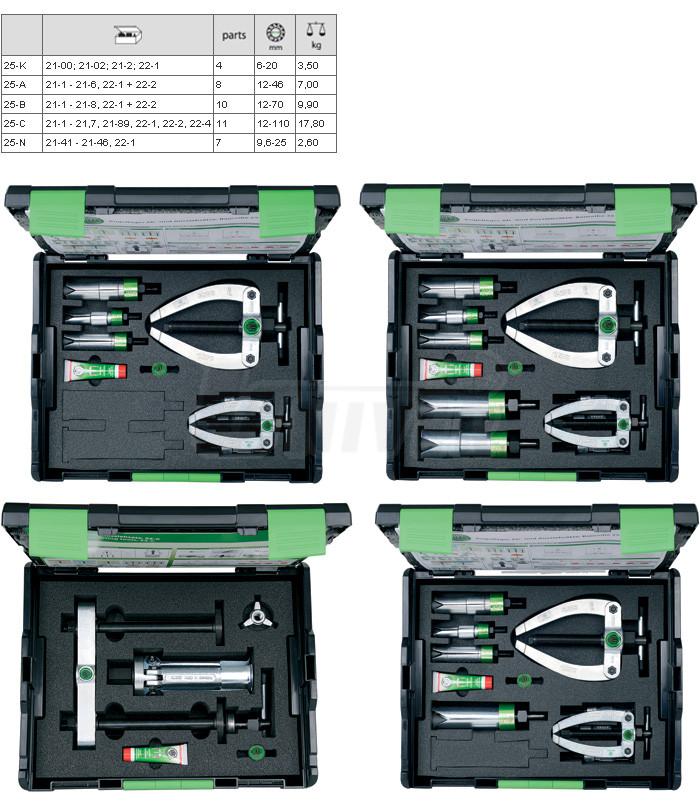 Sady v plastovém kufříku KUKKO BOX SYSTEM (25-A, 25-B, 25-C) jsou sestaveny z různých vnitřních vytahováků, vzpěrných přípravků a tuby speciálního maziva na vřetena stahováků KUKKO Spezialfett.Vlastnosti: