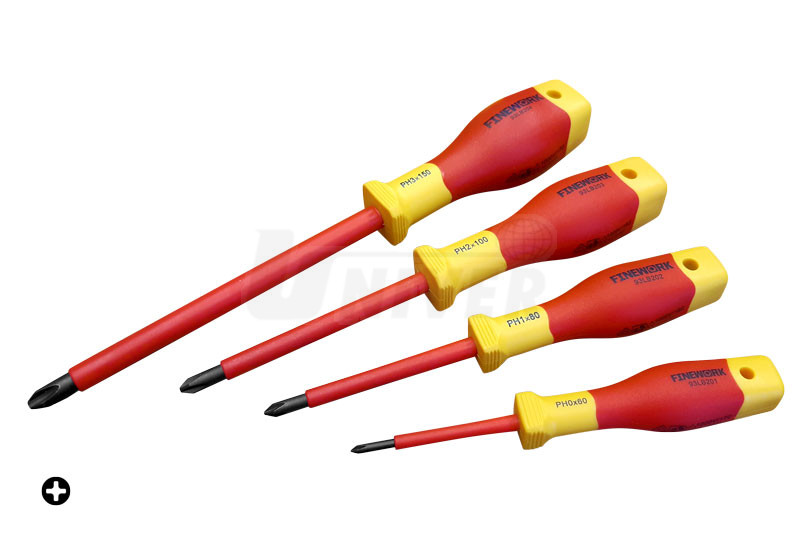 Křížové šroubováky 4 různých velikostí (Phillips PH0 – PH3) klasifikace VDE izolované až do 1000 V.