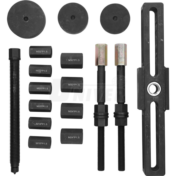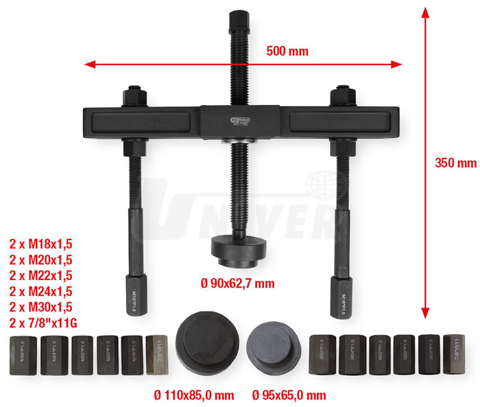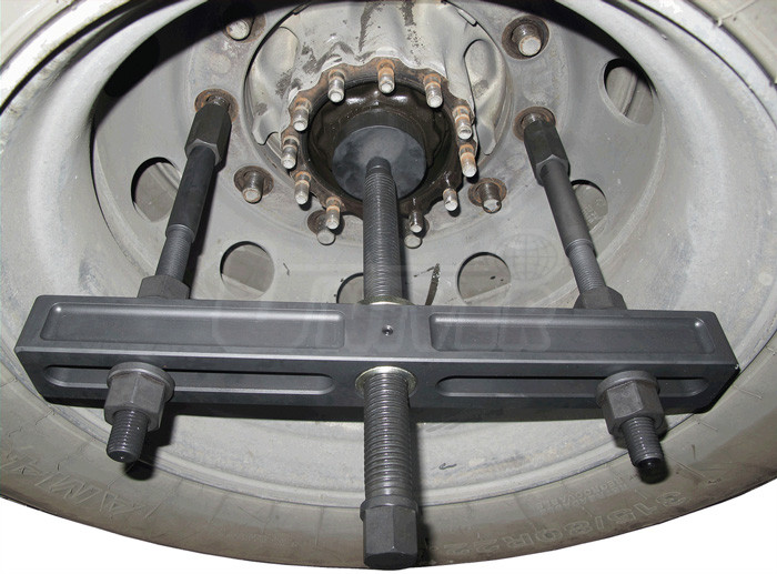 Stahovák na náboje kol nákladních automobilů pro otvory na roztečných kružnicích průměru 110-448 mm a šrouby do průměru 30 mm.- 27-dílná sada tvořící stahovák na náboje kol nákladních automobilů, autobusů atd.