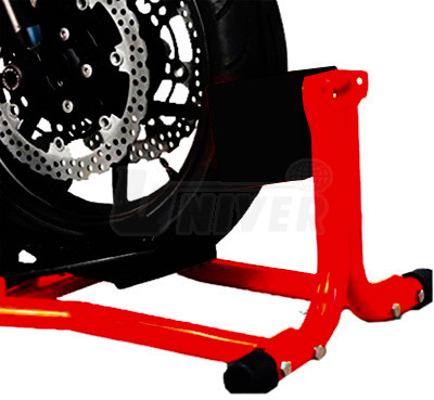 Stojan pro parkování nebo přepravu motocyklů s pneumatikami 16" – 18".- motocykl najede na překlápěcí nájezd stojánku a jeho přední kolo je okamžitě ve stojanu sevřením stabilizováno a usazeno