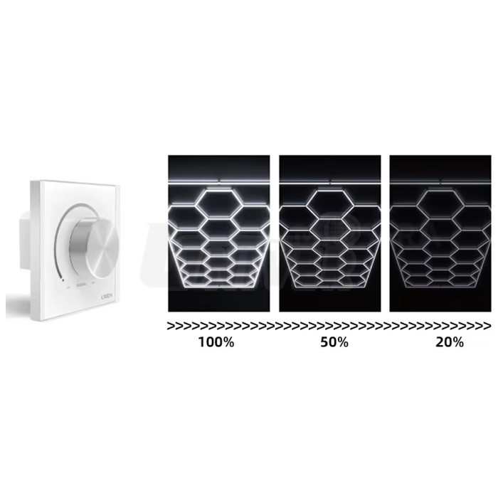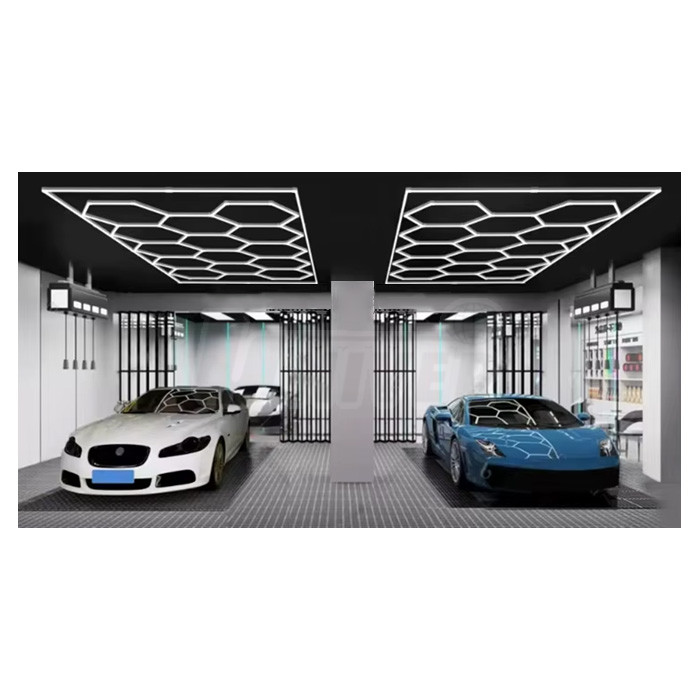 Moderné stropné LED osvetlenie s vysokým svetelným výkonom a plynulým stmievaním k ideálnemu osvieteniu autosalónov, servisných dielní a pod.- šesťuholníkový LED systém s dizajnovou štruktúrou včelieho plástu