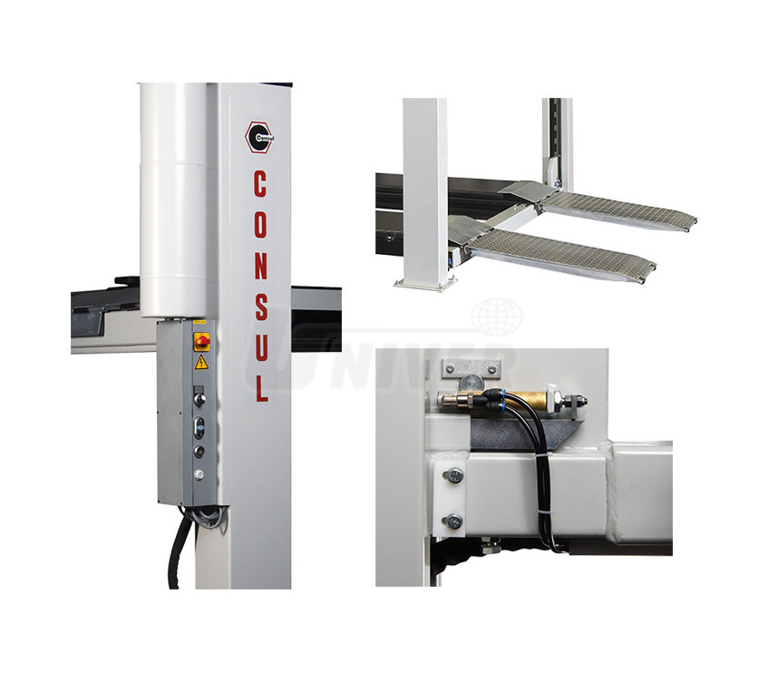 Čtyřsloupový elektrohydraulický kompaktní zvedák (4500 kg) s dlouhými plošinami (4810 mm) pro zvedání velkých osobních automobilů a transportérů.- velmi nízká konstrukční výška ve spuštěném stavu