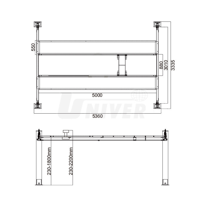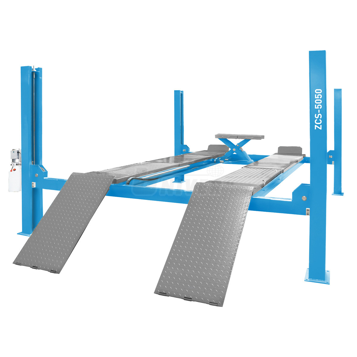 Elektrohydraulický štvorstĺpový plošinový zdvihák s prídavným mobilným nožnicovým zdvihákom pre osobné a ľahké úžitkové vozidlá s nosnosťou 5500 kg s prípravou na nastavenie geometrie kolies.- osvedčená konštrukcia štvorstĺpového elektrohydraulického zdviháka na univerzálne použitie v garážach všetkých veľkostí