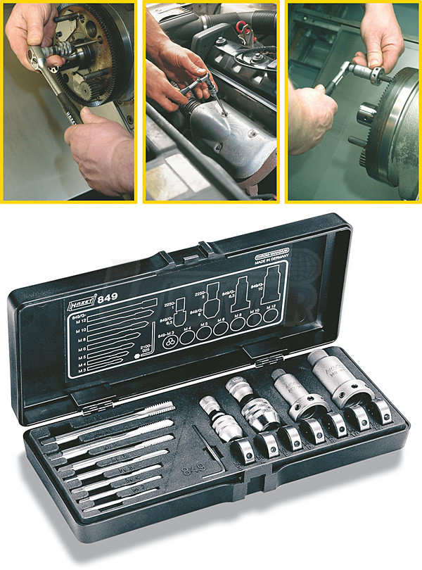 21-dílná sada pro řezání/opravy vnějších i vnitřních závitů M3 až M12 i v obtížně přístupných místech. Závitníky i závitová očka jsou ze speciální HSS-oceli. Řezání se provádí pomocí ráčny.Sada obsahuje: