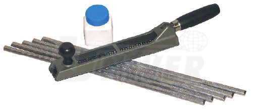 Souprava s cínovou pájkou bez olova a karosářskou rašplí pro kvalitní opravy karosérií automobilů.- souprava umožňuje opravy karosérií cínováním, kterým se vyrovnávají nerovnosti, tvarují hrany, zarovnávají spoje atd. před následným lakováním