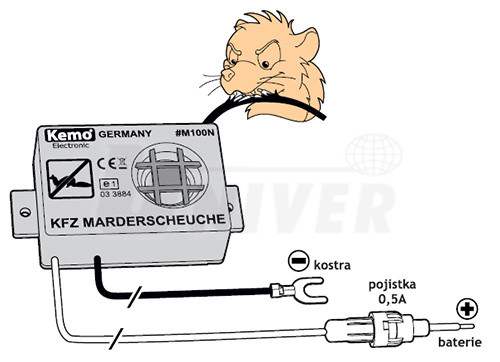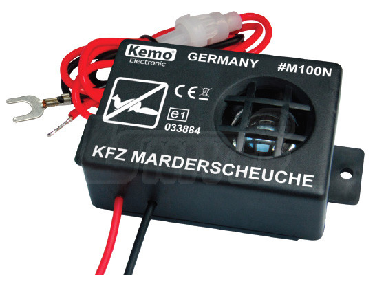 Účinný voděodolný ultrazvukový odpuzovač / plašič kun, myší a potkanů.Toto zařízení vysílá v nepravidelných intervalech velmi intenzivní ultrazvukové tóny s frekvencí cca 23 kHz. Díky tomu je odpuzovač obzvláště účinný, protože je vyloučeno, aby si na něj zvířata zvykla. Odpuzovač je napájen z autobaterie (12V) a je určen převážně pro ochranu automobilů, karavanů, lodí, letadel, zemědělských strojů apod. Zapojujese tak, aby došlo automaticky k jeho aktivaci po vypnutí zapalování, to však neomezuje oblast jeho využití pouze na automobil.