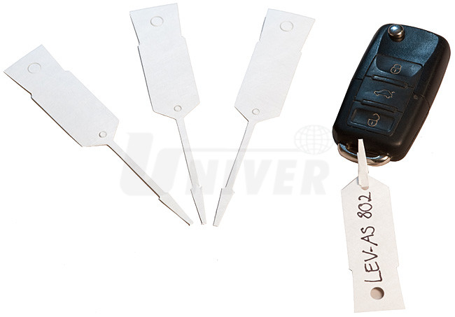 Bílé visačky na klíče s identifikačním štítkem a průvlečným poutkem v baleních po 1000 kusech.- kvalitní bílé popisovatelné visačky na klíče se štítkem a průvlečným poutkem