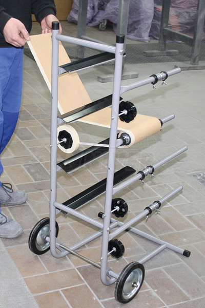 Vozík / pojízdný stojan na 4 role maskovacího papíru max. šířky do 30/45 cm, s odvíječem lepicí pásky a s hřebenem pro trhání papíru.- osvědčený, praktický vozík / pojízdný stojan pro maskování vozidel v lakovnách