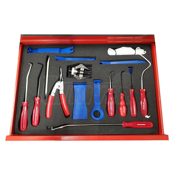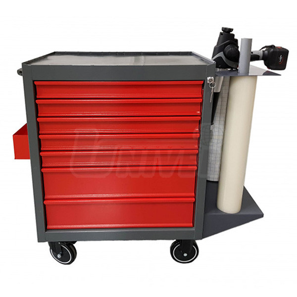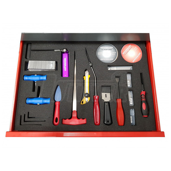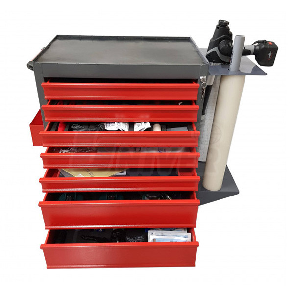 Dílenský vozík s nářadím, přístroji, přípravky a spotřebním materiálem pro opravy, montáž a demontáž čelních skel vozidel.Jednotlivé sady v zásuvkách vozíku (lze je zakoupit každou samostatně)