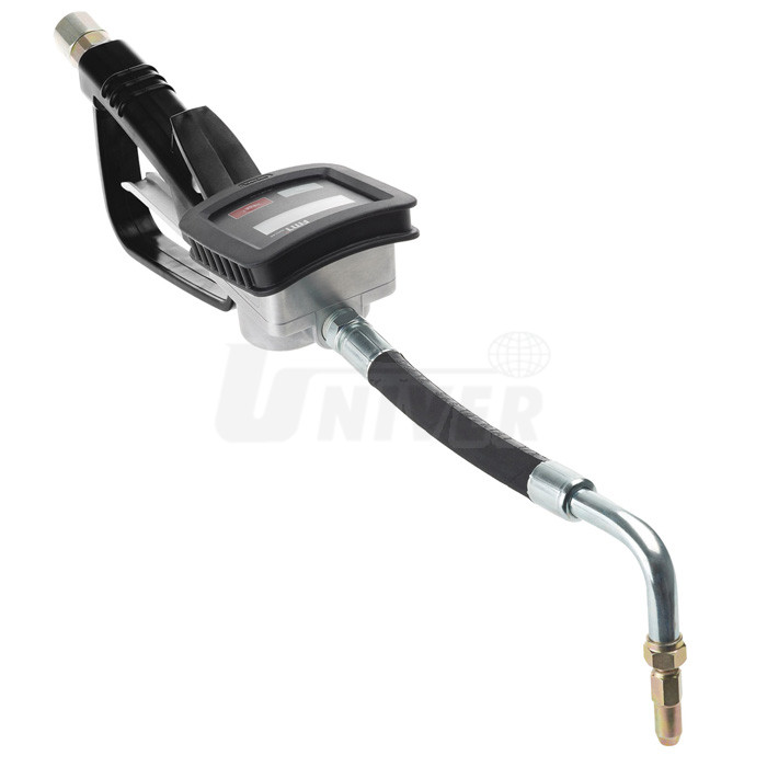 Plnicí / výdejní pistole na olej s digitálním průtokoměrem 0 – 30 l / min, aluminiovou skříní, ohebným nástavcem 90° a otočným kloubem.- plnicí / výdejní pistole na motorový olej SAE 5 až 50 a převodový olej SAE 80 až 240 s ohebným nástavcem zahnutým v úhlu 90°