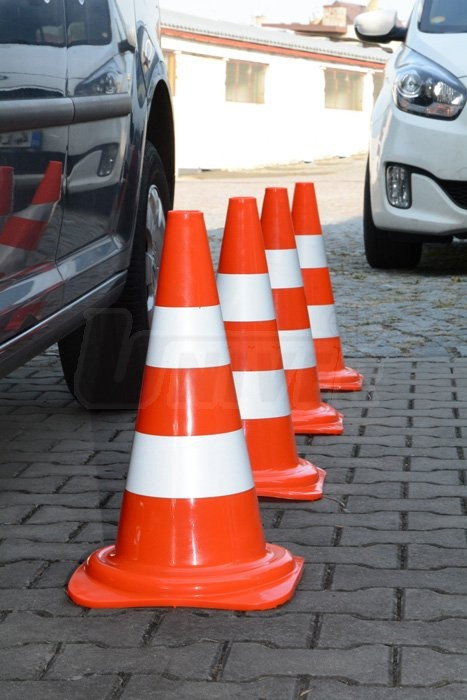 Plastový výstražný dopravní kužel je opatřen 2 reflexními pásky o šířce 80 mm, snadno se přenáší a úsporně skladuje / stohuje.- plastový výstražný dopravní kužel evropského typu výšky 500 mm