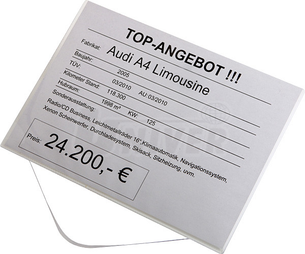 zástrčný průhledný polykarbonátový držák formátu A4 na šířku vysoké kvality se používá zejména pro prezentaci technických údajů a cen nových i ojetých automobilů v showroomech i v autobazarech