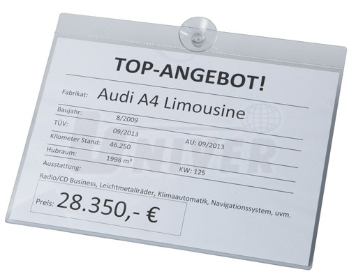zástrčný průhledný polykarbonátový držák formátu A3 na šířku vysoké kvality se používá zejména pro prezentaci technických údajů a cen nových i ojetých automobilů v showroomech i v autobazarech