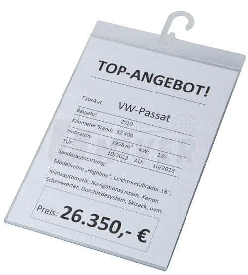 Průhledný polykarbonátový držák formátu A4 na výšku s přísavkou i háčkem.- průhledný polykarbonátový držák formátu A4 na výšku vysoké kvality se používá zejména pro prezentaci technických údajů a cen nových i ojetých automobilů v showroomech i v autobazarech