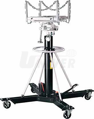 Pojízdný pneumaticko-hydraulický stojanový zvedák s nosností 1000 kg s vrchní upínací hlavicí pro snadnou montáž a demontáž agregátů automobilů.