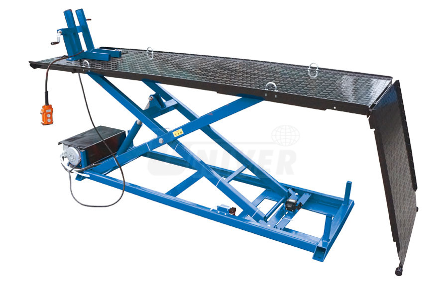 Elektrohydraulický plošinový zvedák s nůžkovou zvedací konstrukcí a s dálkovým ovládáním je určený pro zvedání motocyklů při jejich údržbě a opravách.- elektrohydraulický nůžkový plošinový zvedák pro motocykly s nosností 600 kg