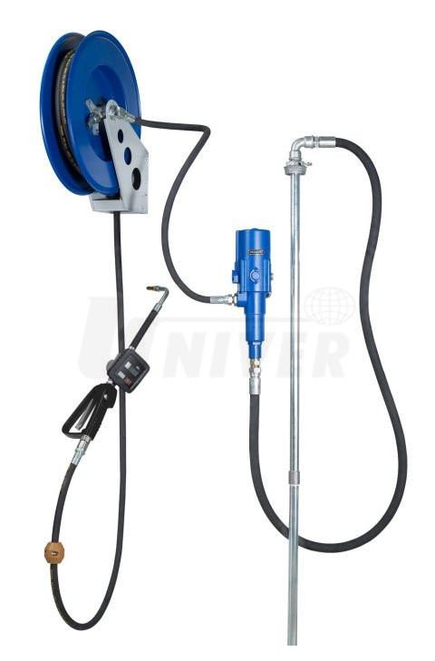 Sestava s pneumatickým čerpadlem 3:1 pro čerpání motorových, převodových a hydraulických olejů ze sudů 200/220 l je vybavena otevřeným samonavíjecím bubnem a výdejní pistolí s digitálním průtokoměrem.Výbava a parametry: