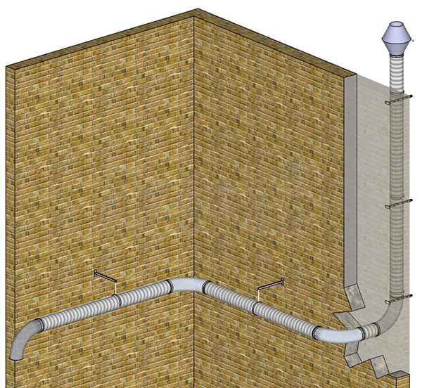 Odvod výfukových plynů motorových vozidel dl. 10 m s průchodem stěnou a s vertikálním vyústěním ve venkovním prostředí.Sestava se skládá z následujících komponentů: ZGS TU (3 ks), ZGS NIP (3 ks), ZGS CR90 (3 ks), ZGS CAP (1 ks), ZGS AP (1 ks), ZGS SME300 (5 ks), GTA (1 ks) a GF (2 ks).